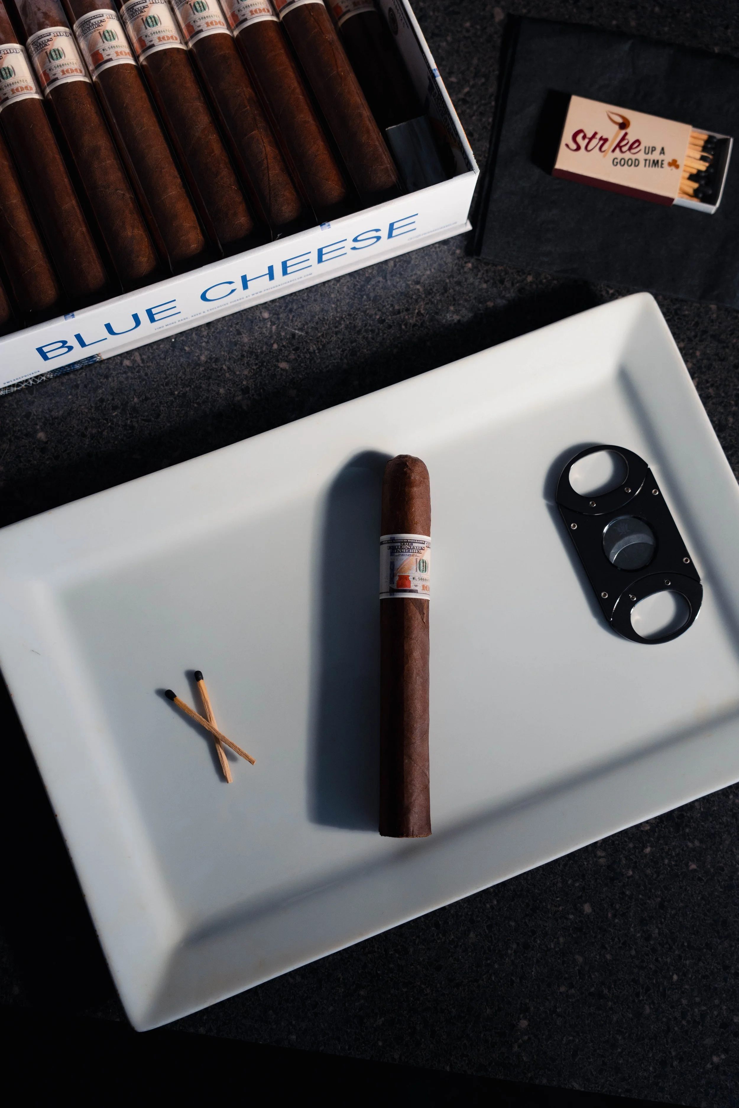 Blue Cheese – slang for a $100 bill, (or more specifically the blue security strip on the bill) but also a Nicaraguan puro cigar, highlighted by a habano wrapper, and produced by AJ Fernandez. Now a regular offering from Privada Club, Blue Cheese is offered in a 6 x 52 toro vitola.